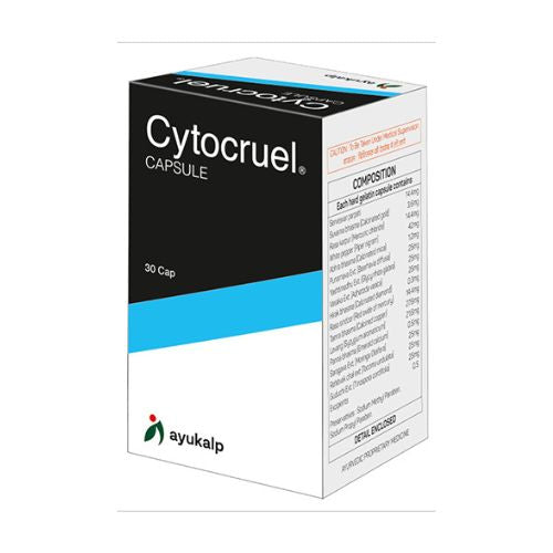 Ayukalp Cytocruel 30 Capsules is an Ayurvedic herbal and mineral supplement designed to support the body in treating various abnormal, degenerative, and inflammatory conditions. The manufacturer, Ayukalp, promotes it as an immune system booster and an aid for managing the side effects of conventional therapies like radiotherapy and chemotherapy.