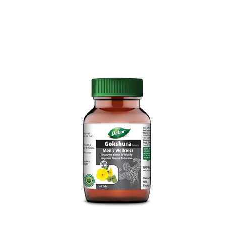 Dabur Gokshura Tablet for Men is an ayurvedic medicine comprising herbal ingredients known for men's wellness. Gokshura helps boost testosterone levels and stamina. It helps promote endurance by allowing oxygen-rich blood to reach the muscles. It boosts energy and helps rejuvenate the body.