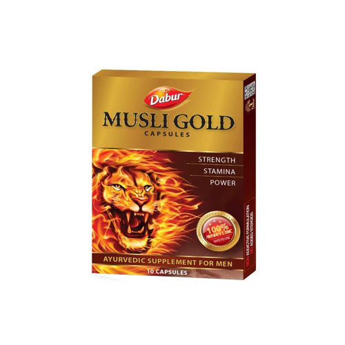 Dabur Musli Gold Capsules for Men is an Ayurvedic formulation that is good for improving strength, stamina and power and beneficial in relieving general weakness. It contains 'Kapikacchu' which is an antioxidant and has a neuroprotective effect. Shuddha musli(Purified Shilajit), helps in ATP synthesis in muscle, is useful in stress management and has antioxidant properties.